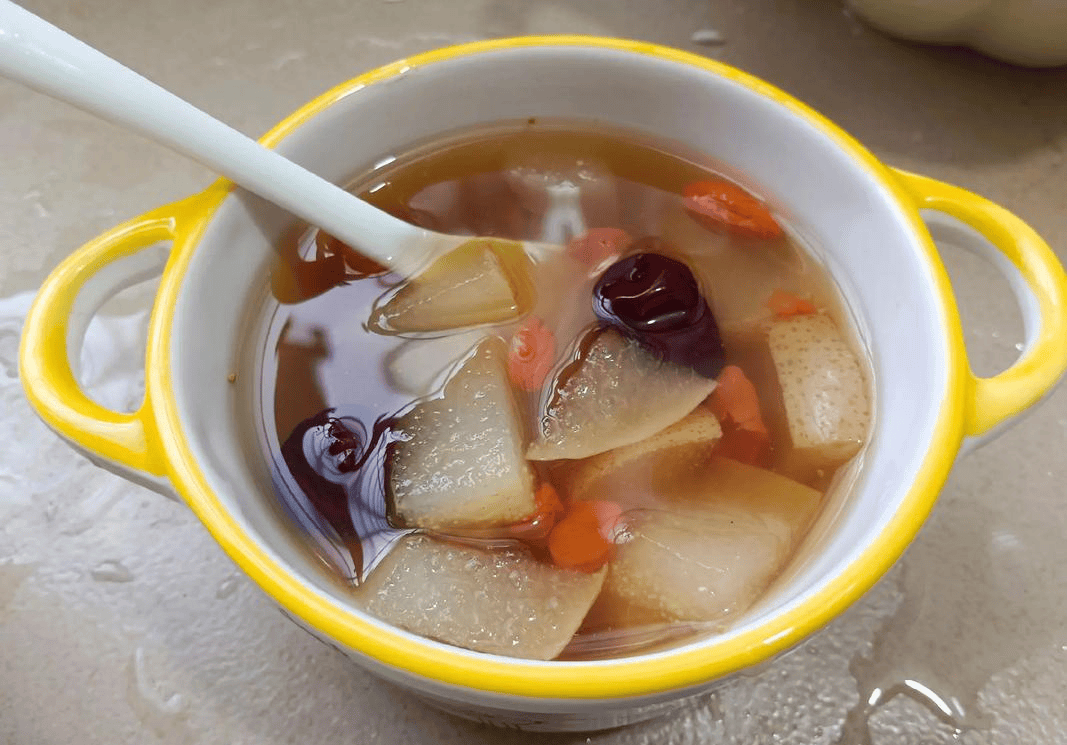 第三种,梨汤煮银耳,润燥又养颜,适合爱美的女士。银耳富含胶原蛋白,搭配梨子的清甜,不仅能润燥,还能提亮气色。准备1个梨子、半朵干银耳、适量冰糖和枸杞,银耳提前用温水泡发,撕成小朵,梨子洗净去皮,切成小块;锅中加入适量清水,放入银耳,大火烧开后转小火慢煮20分钟,再加入梨块和冰糖,继续煮10分钟,最后放入枸杞,煮5分钟即可关火。煮好的梨汤,银耳软糯、梨肉清甜,汤汁浓稠,喝上一口,滋润到心底,长期饮用,还能改善皮肤干燥的问题。